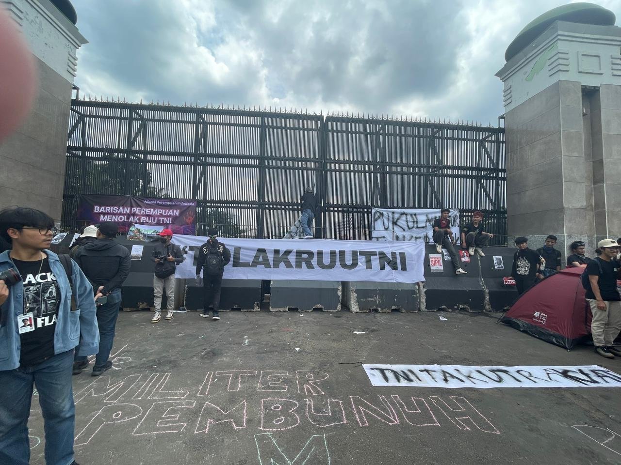 Sejak pagi, massa aksi terus berdatangan dari berbagai universitas di Jakarta dan sekitarnya. Mereka mengenakan almamater masing-masing dan membawa berbagai spanduk serta poster berisi penolakan terhadap revisi UU TNI. Beberapa peserta aksi bahkan menuliskan protes mereka di pagar Gedung DPR RI menggunakan cat semprot.