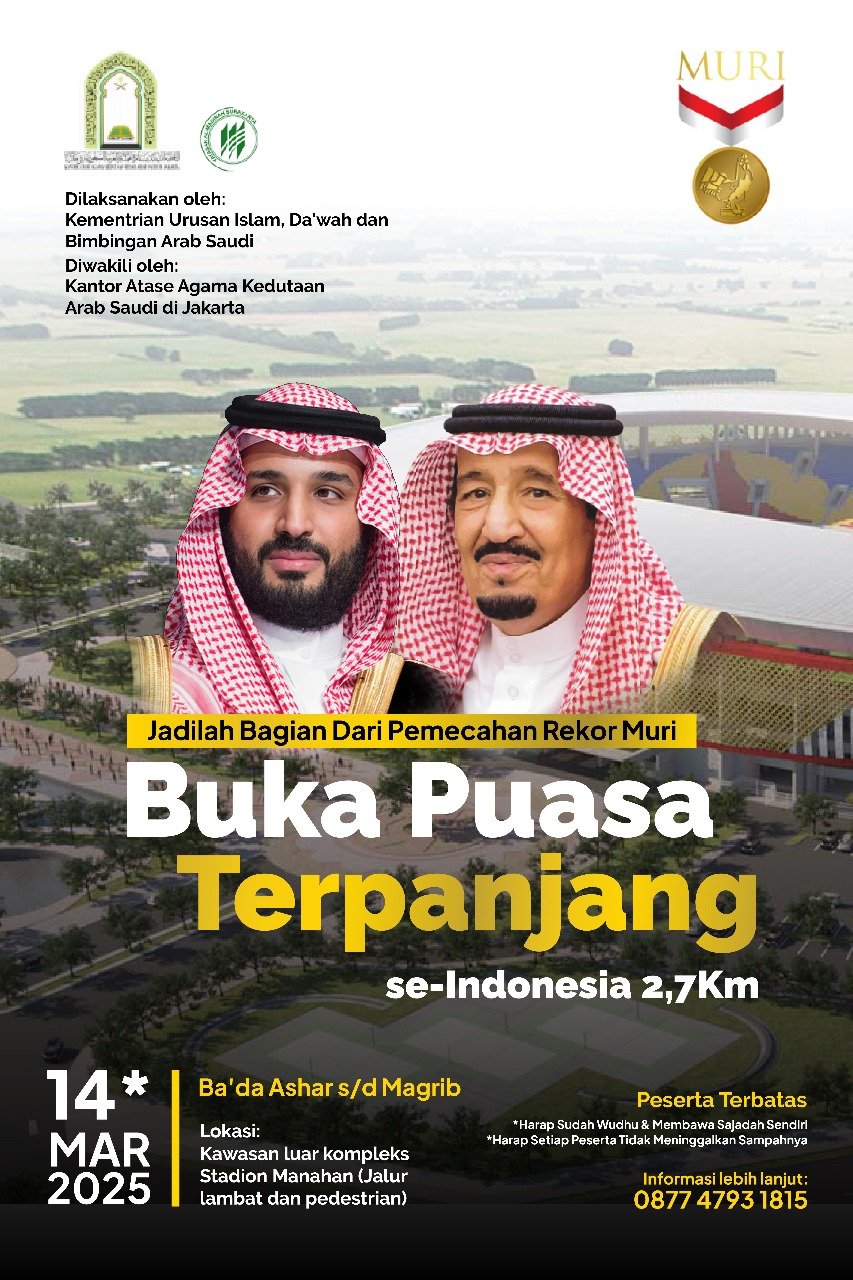 apakabar.co.id, SOLO - Pemerintah Kota Solo bekerja sama dengan Atase Agama dan Pendidikan Kedutaan Besar Kerajaan Arab Saudi akan menggelar acara buka puasa bersama terpanjang yang memecahkan rekor MURI pada Jumat (14/2) besok.